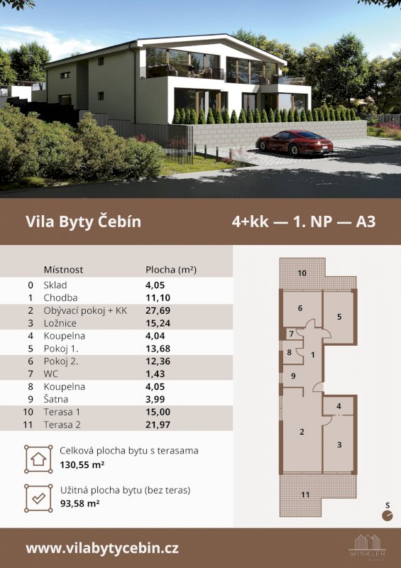 V nově vznikajícím projektu nabízíme k prodeji prostorný byt 4+KK o ploše 93,58 m² s dvěma terasami o velikostech 15 m² a 21,97 m², v klidné lokalitě obce Čebín, která je vzdálena pouze 12–15 minut od Brna. Čebín nabízí veškerou občanskou vybavenost včetně obchodu, školy a školky, a je dobře propojena s Brnem vlakovým i autobusovým spojením, čímž odpadá nutnost automobilu.