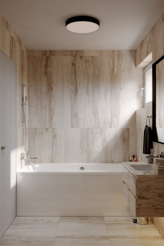koupelnu s nadčasovými zařizovacími předměty a velkoformátovými obklady