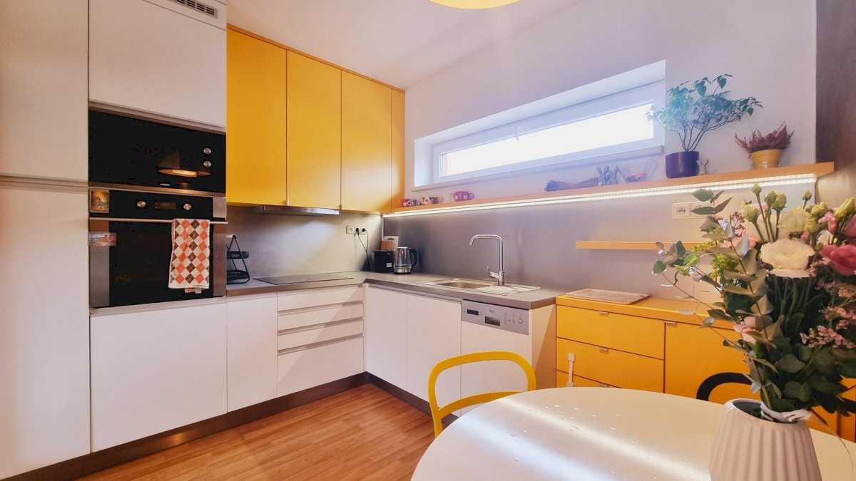 V kuchyni (9 m²) je kuchyňská linka na míru s indukční varnou deskou, elektrickou troubou, mikrovlnkou, digestoří, ledničkou, myčkou, jídelním stolem s židlemi a kompletním nádobím.