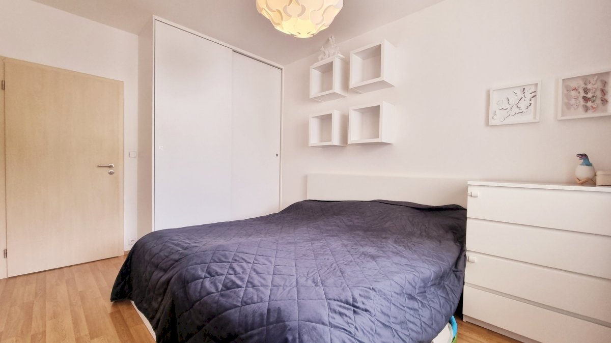 Ložnice (12,5 m²) je orientovaná do vnitrobloku a zajistí vám tak klidný spánek, spolu s venkovními manualními žaluziemi. Vybavena je manželskou postelí s lůžkovinami, vestavěnou skříní a komodou.
