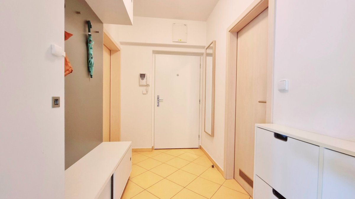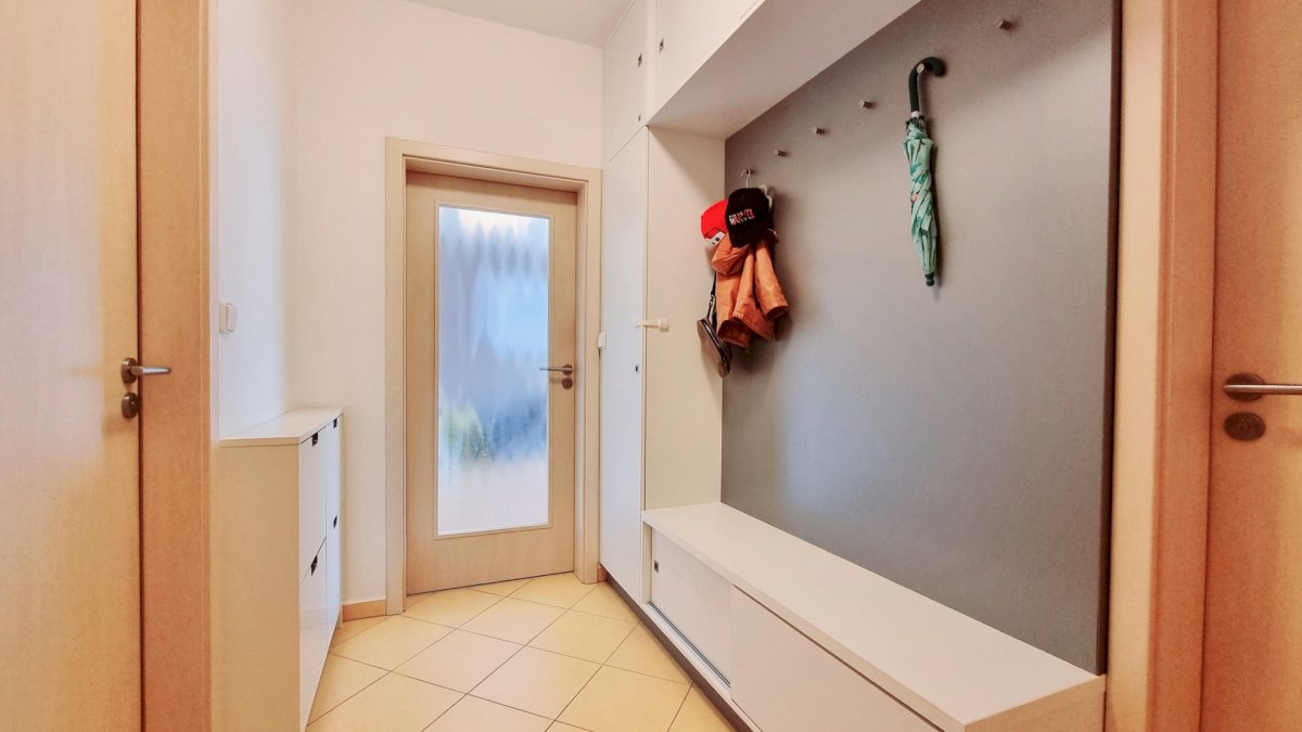 Předsíň (5 m²) má vestavěné úložné prostory, včetně botníků, věšákové stěny a intercomu.