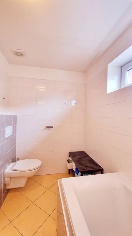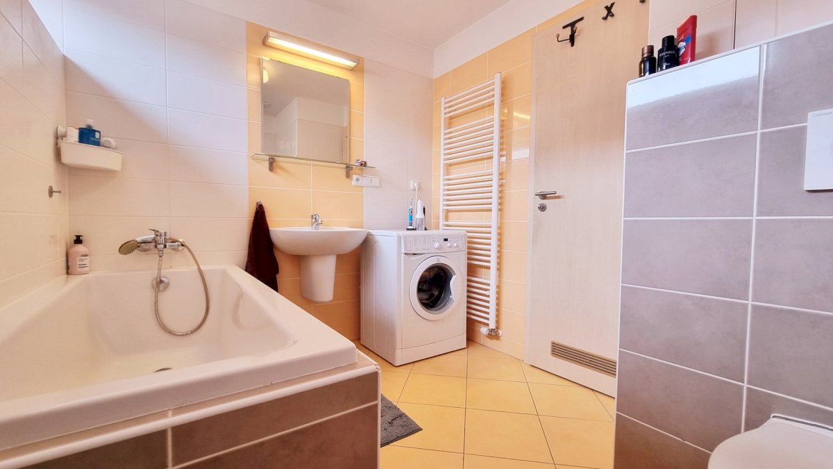 V koupelně (5,7 m²) je vana, umyvadlo, otopný žebřík, toaleta a pračka.